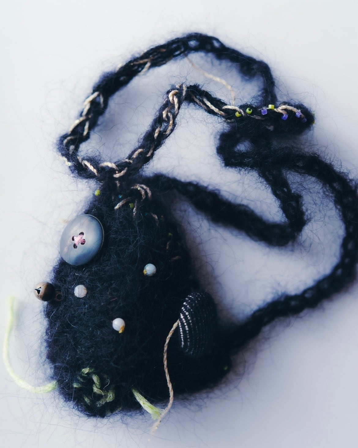 お守りをモチーフにしたzaycaのニットポーチに、ペインターのユカが絵を描くように刺繍をしたコラボレーションアイテム。光っていたり、尖っていたり、はみ出していたり。それぞれのチャームポイントが愛らしい、身にまとうお守り入れです。